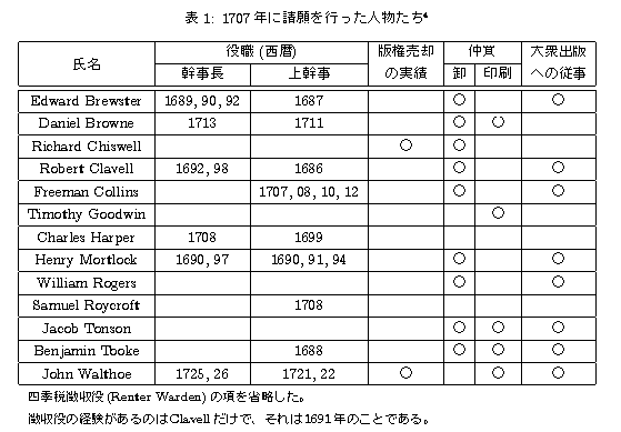 本を執筆するために、学識のある人物は多大な時間と多額の費用を費す。そして、 権利の譲受人によって印刷させるために、かなりの額の報酬と引き換えに、 あるいは彼自身と彼の家族の利益のために一部分の権利を残して、 著作者は原稿を譲渡するのである。そしてまた、譲受人にしても、 そのような彼らの財産を当てにして、 彼らの死後残される妻や子供たちのための準備をしているのである。しかし、 近年そのような財産が、同じ書籍をイギリスで印刷している、 あるいは海外で印刷して輸入している他者によってひどく侵害されている。 このことが、社会に大変役に立つ執筆の仕事から人々を遠ざけ、 権利者たちに多大の損害を与えているのである.....この請願は、著作者の財産保護を理由にして、 取引上の財産権の安全を保護するように誘導しているが、請願書を提出した人物が、 13人の書籍業カンパニーの中心人物だったことから、 保護の対象として重視されているのが著作者ではなく「譲受人」「購入者」 であることがわかる。
