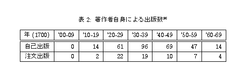 17.1 著作者たちの試み1709年制定法が与えた進歩的影響は、著作者の方に顕著だった。 少なくとも趣意文の冒頭に著作者が権利の源泉として謳われたことは、 彼らの権利者意識を向上させたのである。1715年以降、著作者自身の費用による出版が一時的に増加する。これは、 自らの作品による利益をなんとか自らのものにしようとする著作者たちの努力の現れ だとみることができる。1710─1773年の間に、160人の書籍業者以外の人物が、 印刷業者に印刷を依頼して315冊の書籍を出版している [30]。 当時の書籍販売業界の主な取扱品目は、依然としてシェイクスピアやミルトンなどの、 安定した人気を維持している、すでに古典化した作品であり、 全く新しい出版物が刊行されることはそれほど多くなかった。 その中で315種類の新しい出版物が、書籍業者以外の人物から出版されていることは、 決して少ない数ではない。 こうした出版は、18世紀の終わりまでには衰退してしまう。その原因には、 複雑な出版業界の流通経路を十分に活用できず、 経営的に成功しなかったという理由もある。しかしそれ以上に、書籍業者たちが、 こうした個人出版書籍を積極的に宣伝しなかったのも大きな理由である [31]。書籍業者たちは、 出版事業に際して、わずかでもコピーライトの持分を持っており、 積極的に宣伝し販売量を増やすことで、 取り扱いから生じる利益の他にコピーライト持分に応じた配当金を期待することがで きた。ところが、 このような個人出版からは配当金の利益が期待できないのであるから、 煩わしい宣伝などするはずがなかったのである。 また、個人出版において経営的危険を避けるために、「注文出版」 (retail subscription) と呼ばれる形態が生じた。 すでに印刷されている書籍の版について、書籍販売業者たちの間で注文者を募り、 未製本の印刷シートの状態で売却したのに始まり、最終的には、 印刷するしないが決定される以前に、 書籍のコピーライトの持分への加入者を募集することになった。 これらの二つの方法は出版者たちにの間では、「卸売」(wholeseling)、 「コピーライト加入」(copyright subscription) と呼ばれた [32]。しかし、 この注文出版形態も18世紀の終わりには衰退してしまった。その理由は、 注文者から前金を受け取ったものの出版されないなどのトラブルが多かったからであ る [33]。また、 個人出版と同様に書籍販売業者たちが積極的に宣伝をしなかったことも原因として挙 げられる。 このように個人出版はなかなか困難であり、 著作者たちは結果的に書籍販売業者に従属しなければならなかった。 首尾よく第1版の売行が好調であれば、 書籍業者たちからコピーライトの譲渡を打診された。 面倒ごとを嫌った著作者は喜んでコピーライトを売却してしまった。 第1版が著者から出版されていても、第2版以降が、 書籍業者から出版されている例がしばしば見られるのである [34]。